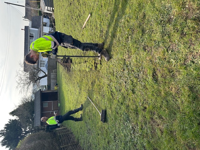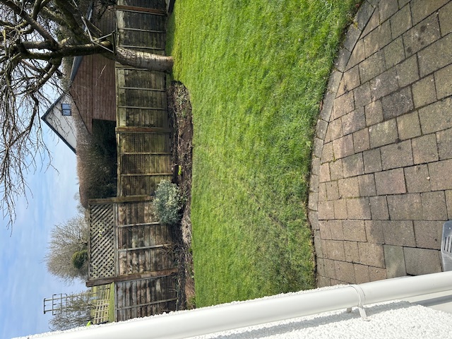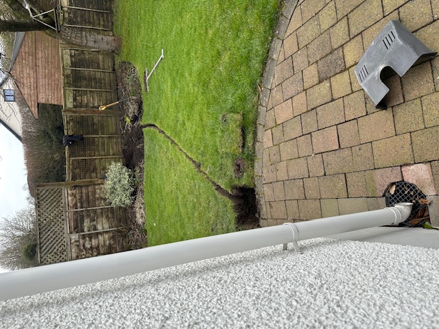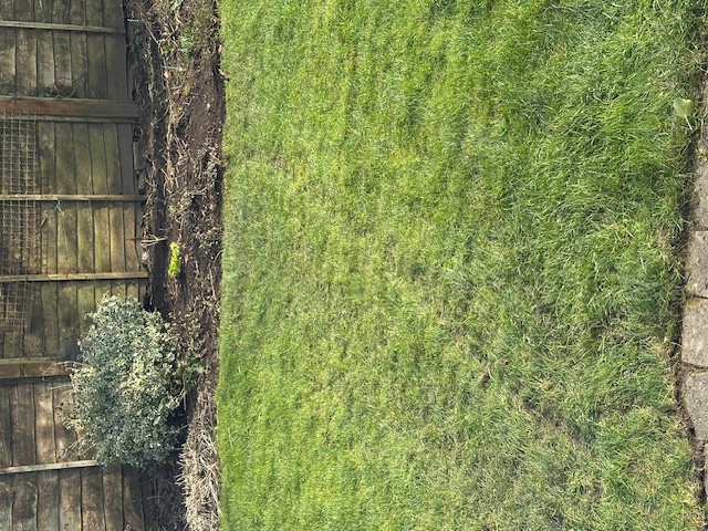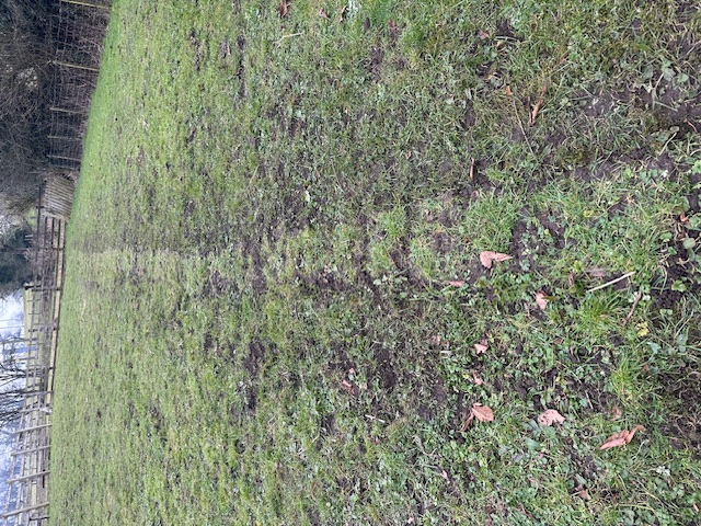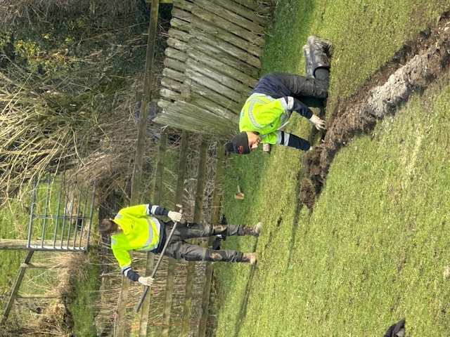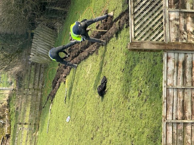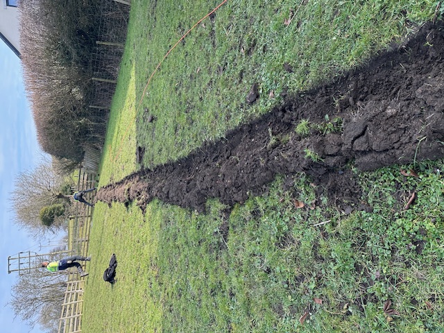 The garden dig happened almost as if by magic from the cut in the lawn & flower bed, to lifting & replacing the paving and passing under the fencing into the field. The field dig was not so simple as it is full of very large stones, but they dug by hand, (requiring pick axe and a large disc cutter in places) and replaced the sods with as much care as if it was a prized lawn, even brushing it to finish! As the photos show, you can hardly see where they’ve cut and the grass will knit back together in no time.